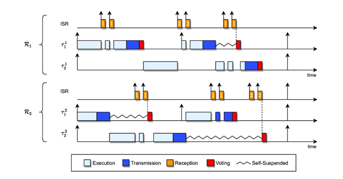Example schedule of two replica-pairs under passive waiting. (Image from paper, Scheduling Replica Voting in Fixed-Priority Real-Time Systems, presented to ECRTS 2021 conference.)